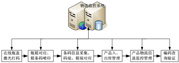 利 用整箱賦碼技術(shù)在每一瓶啤酒的瓶蓋上打印一組身份信息數(shù)碼、每個紙箱指定位置噴印相應(yīng)的條形碼信息,實(shí)現(xiàn)單瓶與成品箱的對應(yīng)賦碼。碼垛時,將箱和托盤組成 對應(yīng)關(guān)聯(lián)。系統(tǒng)通過對生產(chǎn)、入庫、倉庫管理、出庫發(fā)貨、報(bào)損、盤點(diǎn)等環(huán)節(jié)的追溯管理,可對每一瓶酒的相關(guān)信息進(jìn)行精確的信息追溯。