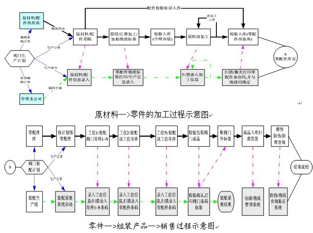 系統(tǒng)描述:聯(lián)塑燃氣閥門,由若干個零件組裝成一個成品閥門。在生產過程中,在每一個注塑后的毛坯上粘貼一個零件碼,用手持終端登記錄入系統(tǒng)。毛坯加工成零件后,在每個零件上用激光機打印該條形碼的內容。在組裝的過程中,使用條碼識讀設備,讀取每個裝入的零件的條碼標簽信息,對每一個零件每一個組裝步驟進行掃描錄入,產品組裝完畢后,系統(tǒng)會驅動條碼打印機打印一個產品碼,組成閥門的所有零部件的信息與該產品碼進行綁定,該條碼和零件碼建立一一對應關系。通過對產品的生產、倉庫、銷售、市場流通的各個環(huán)節(jié)的精確監(jiān)管,實現(xiàn)產品的精確信息追溯。